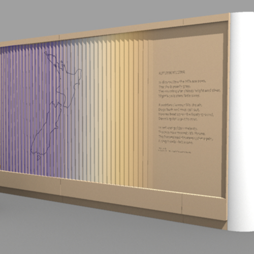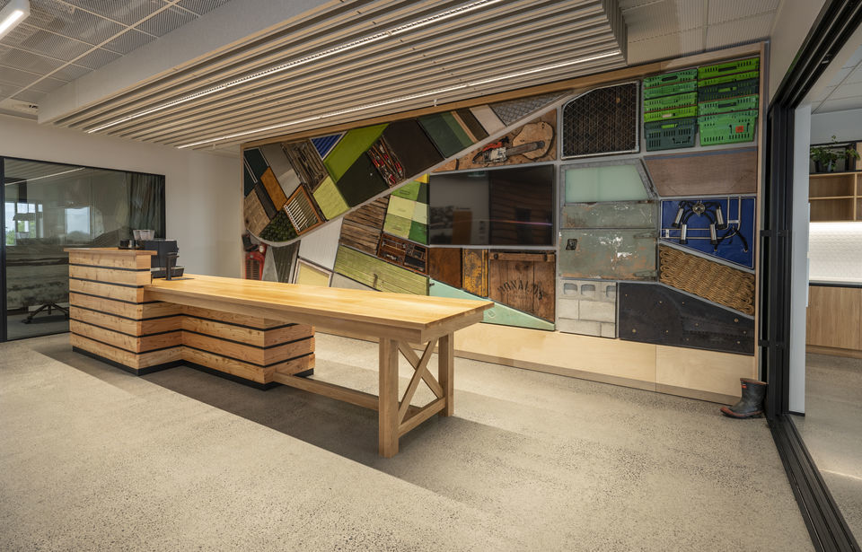 "I took a bird's eye view of farmland as a whole. Individually paddocks are portrayed by individual materials, chosen for their texture, form, colour and relevance. These panel or fields simulate pasture, crops, and land in different states. This choice of materials is confined to ones that are recognizable and relatable to agricultural and horticulture sectors. Building a bridge between the bank and their core clients. But also presented an artistic branding to all customers, visitors and staff. The spacial artwork aims to be a talking point and promote connection and sense of belonging. In turn relaxing those in this coffee station and ‘kitchen table’ zone of the bank offices.