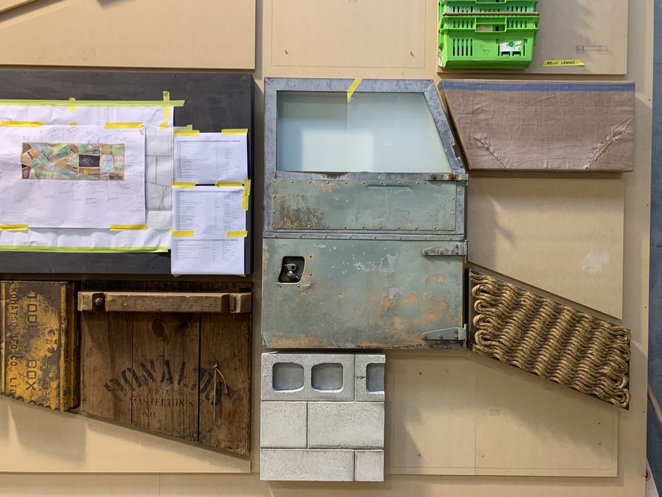 Each panel has its' own story, told through its materiality and history. Some new finishes speak to the current and future environments in farming. While found objects and elements reference to history and time worn processes, via their substance and patina. Each material is recognisable in itself and also portrays an alternative perspective, seen through the DOWN TO EARTH lens."