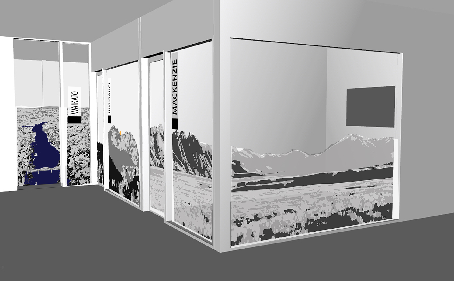 Privacy screens for meeting rooms were developed using a long panoramic monotone, landscape with different sections applied to different rooms.