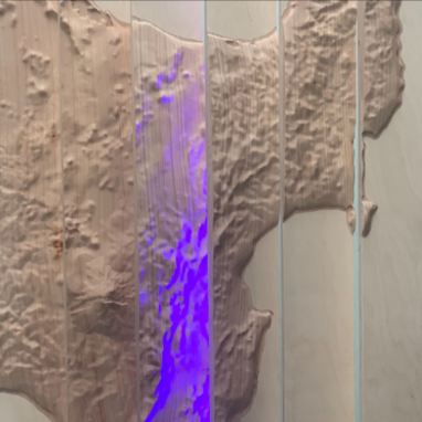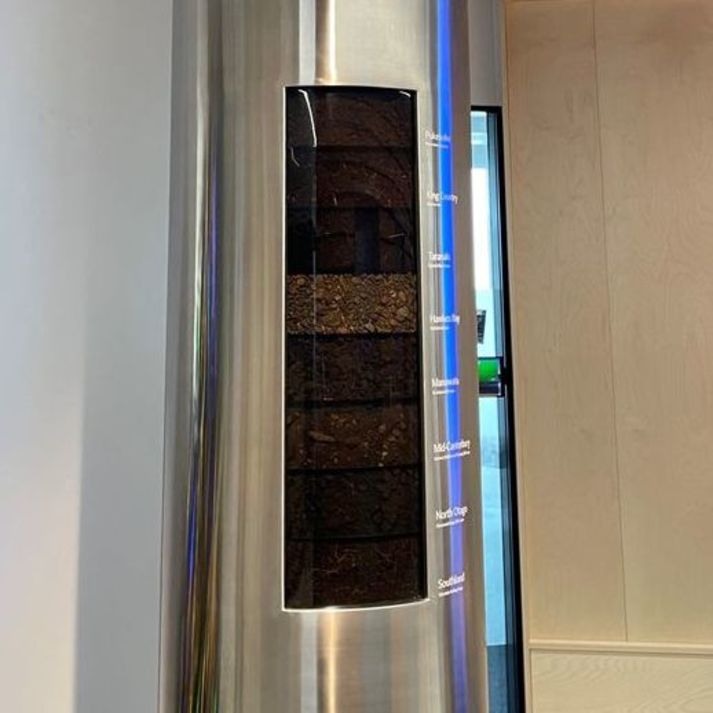 The Core Sample Pillar displays regional soil types display as core sample. The pillar is wrapped in stainless steel evoking the milking equipment of the dairy industry. The soil samples are cast in resin to display their unique characteristics.